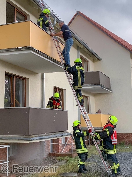 Da eine Person auf einem Balkon des betreffenden Mehrfamilienhauses stand, wurde eine Rettung mittels vierteiliger-Steckleiter durchgeführt.